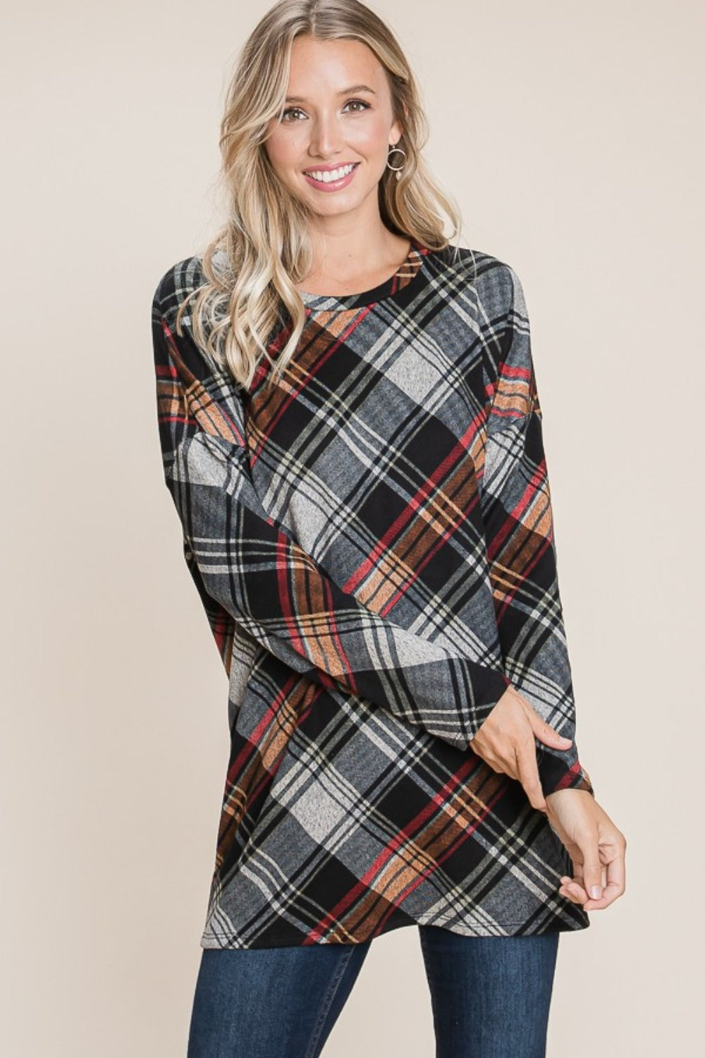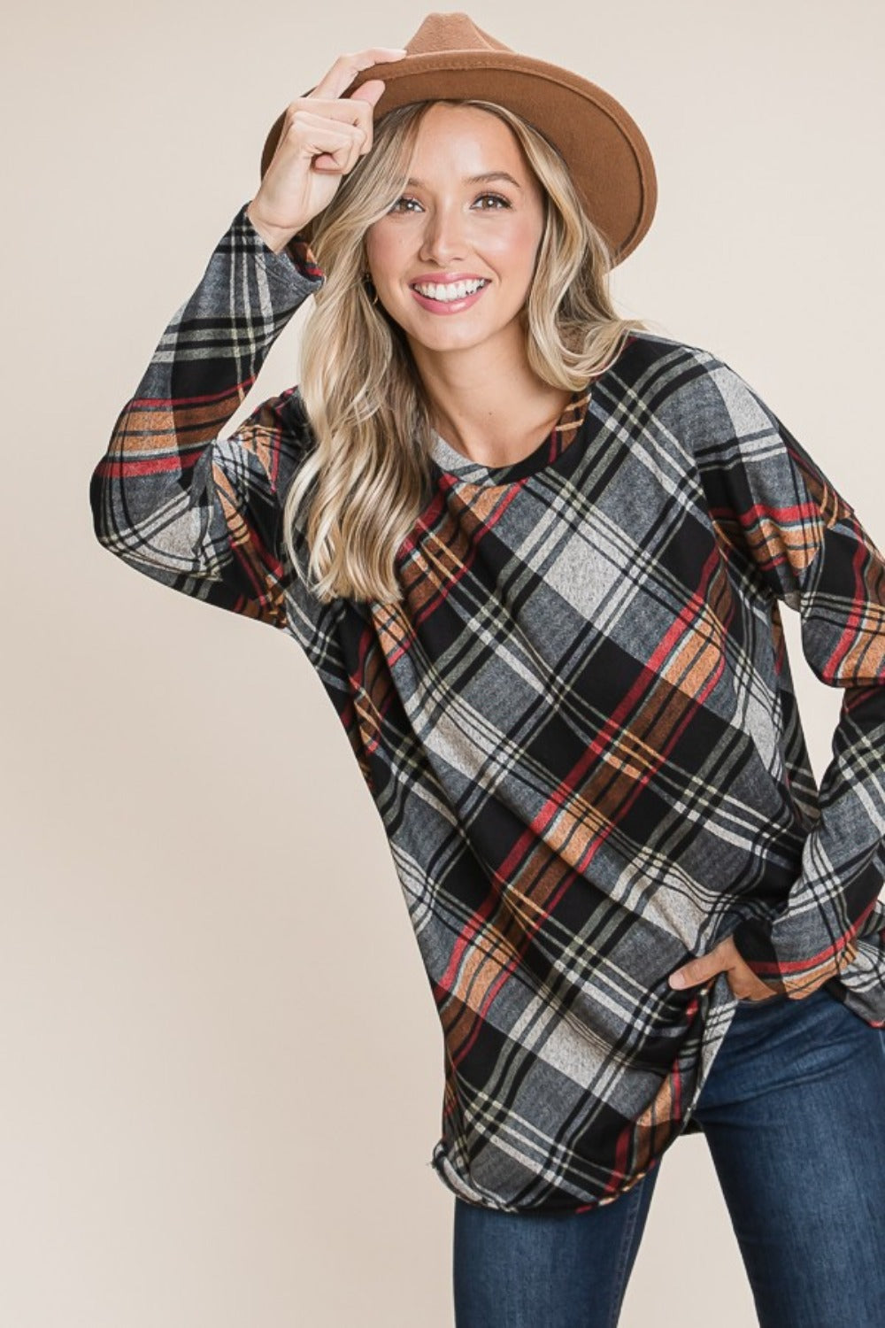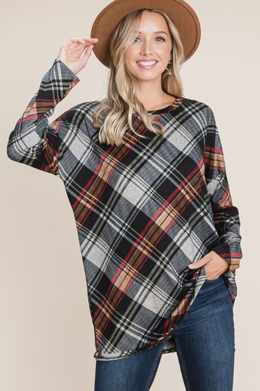BOMBOM Plaid Round Neck Long Sleeve Knit Top
