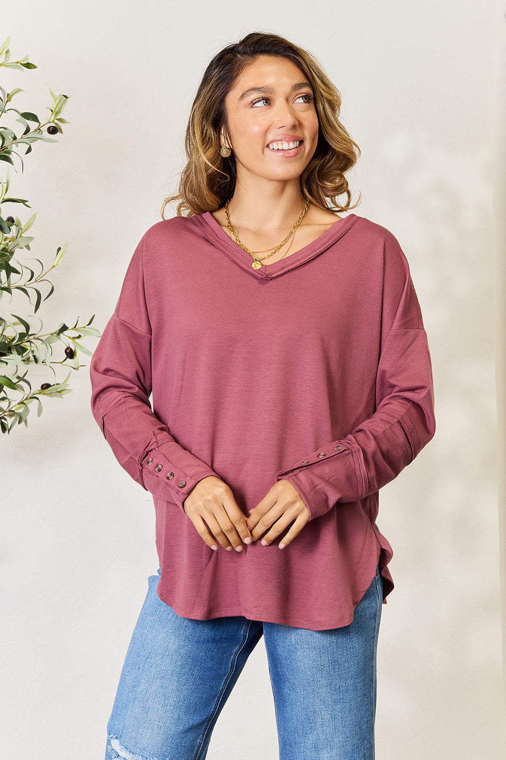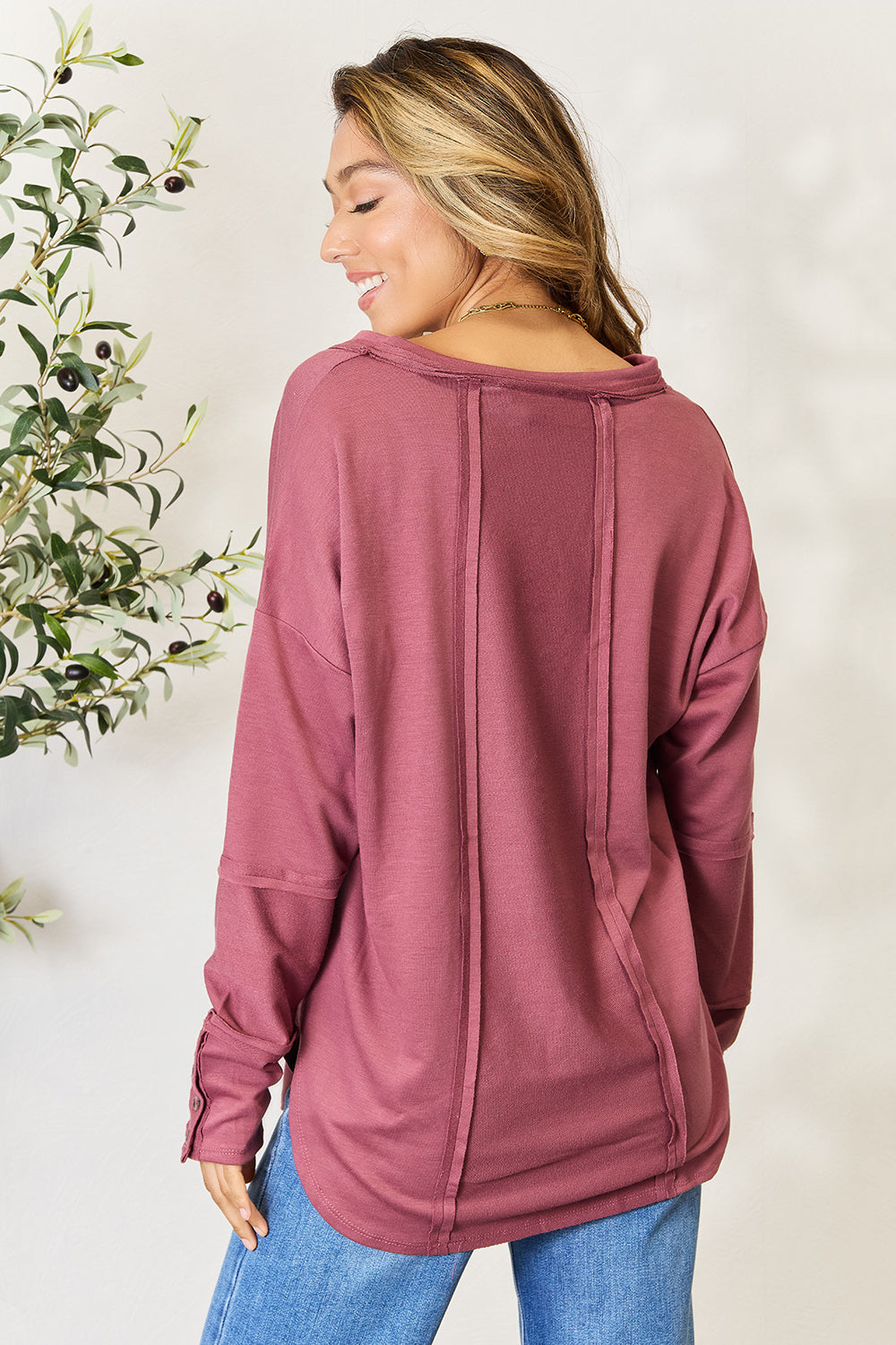 Culture Code Full Size V-Neck Exposed Seam Long Sleeve Blouse