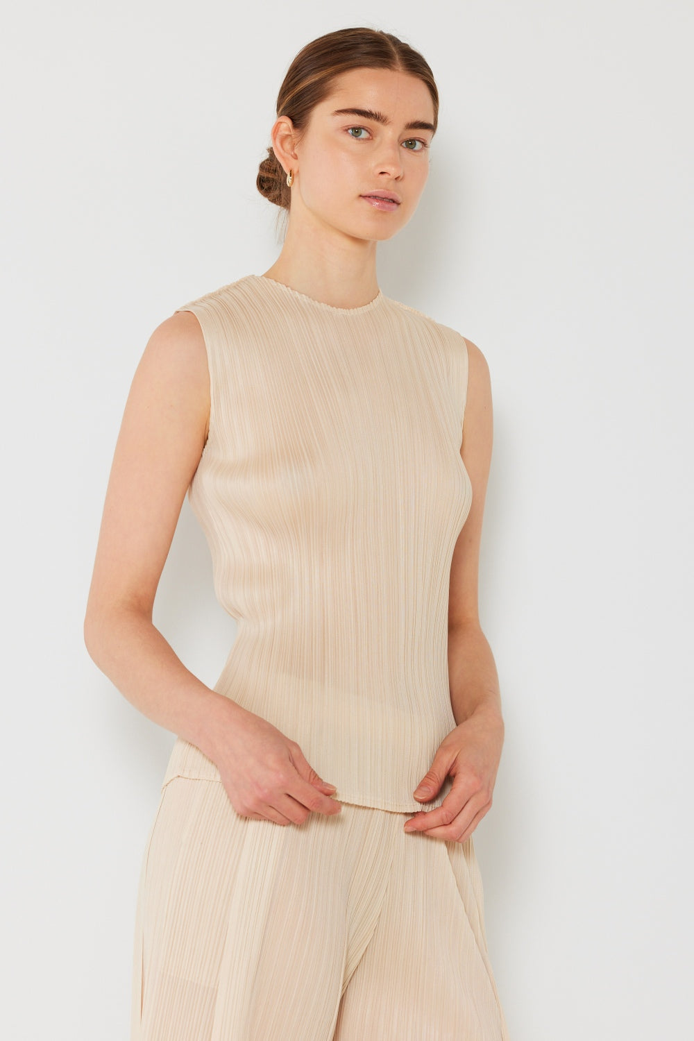 The pleated sleeveless crewneck tank is a chic and versatile piece for any wardrobe. The pleats add a stylish and elegant touch to the classic tank top design. With a crewneck neckline, this tank offers a timeless and flattering look. The sleeveless silhouette is perfect for layering or wearing on its own during warm weather. This tank can be easily dressed up or down for a variety of occasions. Overall, the pleated sleeveless crewneck tank is a versatile and sophisticated addition to any outfit.