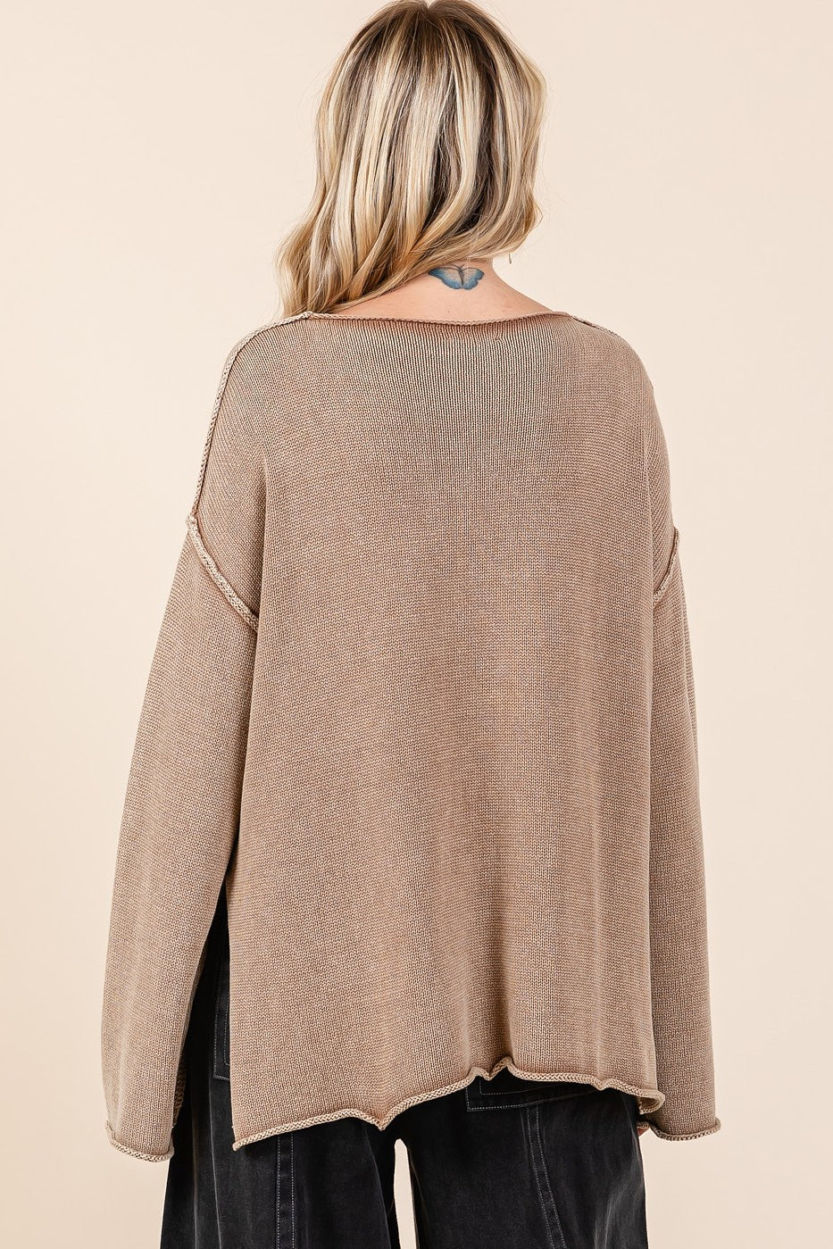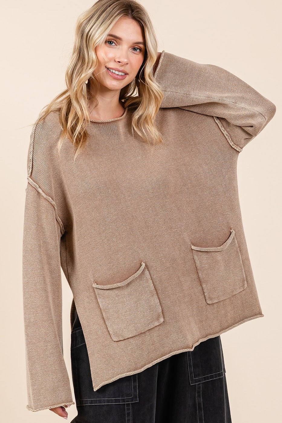 The Mineral Wash Patch Pocket Cut Edge Sweater is a trendy and unique addition to your casual wardrobe. This sweater features a mineral wash design that adds a cool, lived-in look. With patch pockets and cut edge detailing, this sweater offers both style and comfort. Perfect for a relaxed yet chic outfit, this sweater is a must-have for cozy days.