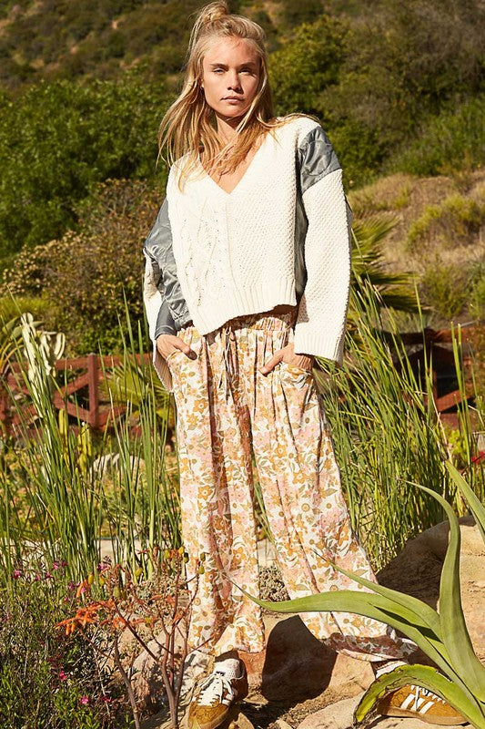 POL Cable Knit Quilting Patch V-Neck Contrast Sweater