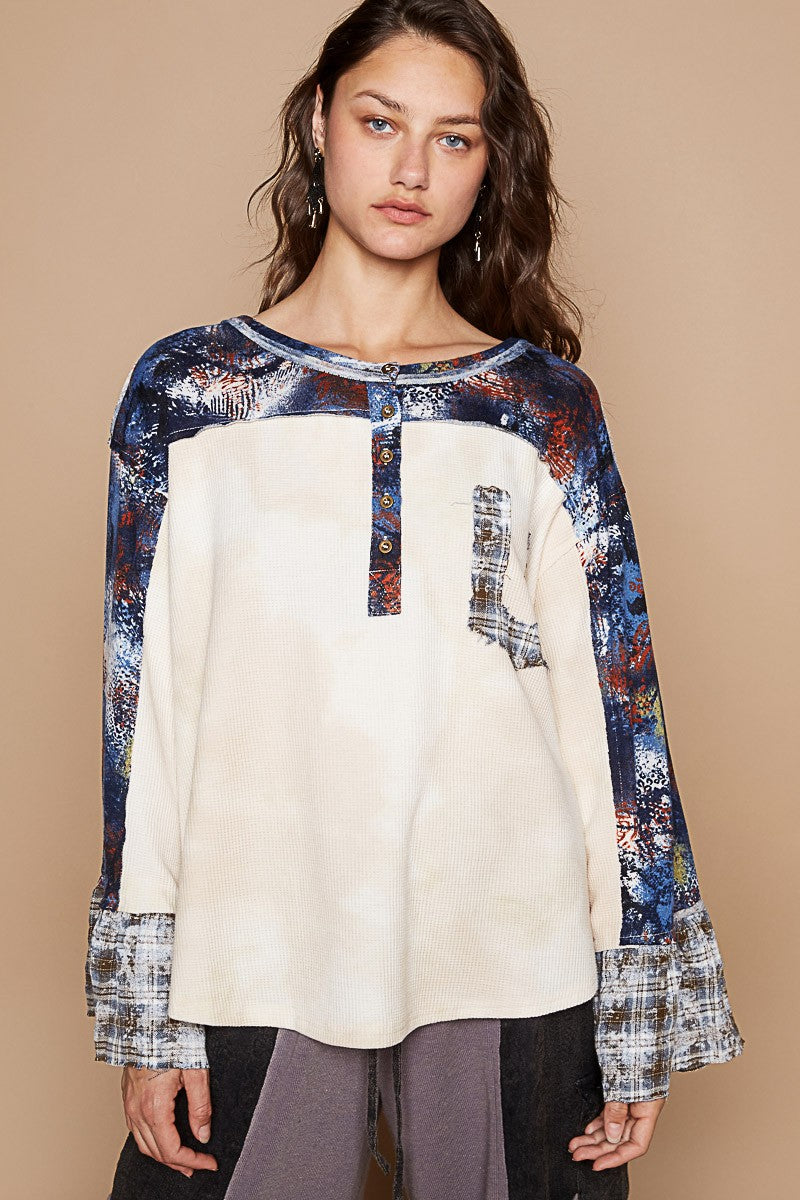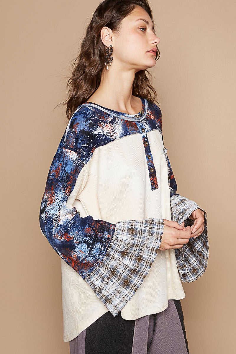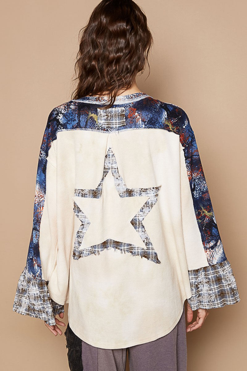 POL Round Neck Plaid Contrast Star Patch Blouse