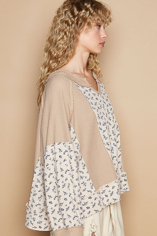 POL Waffle Knit Floral Notched Long Sleeve Top