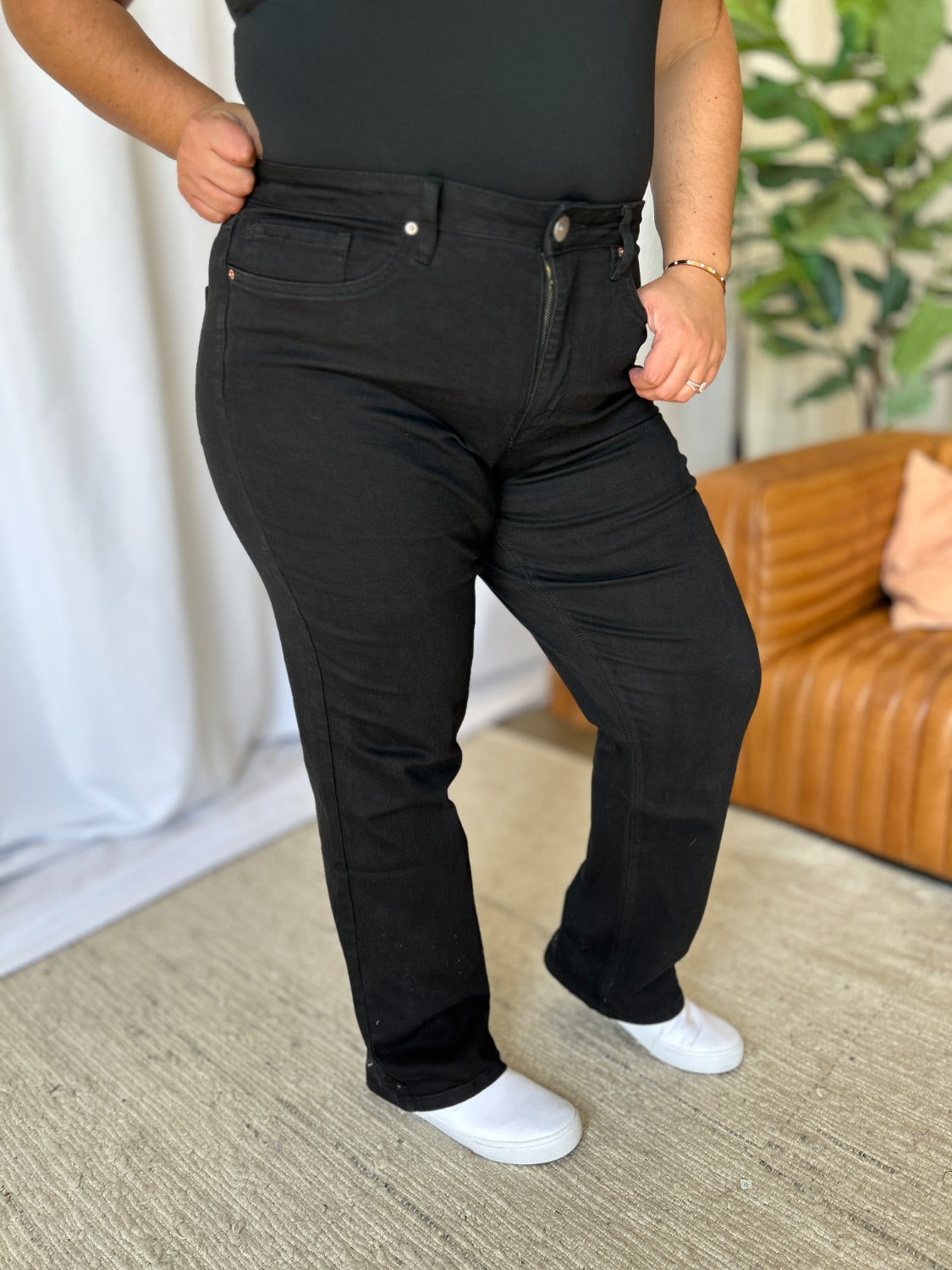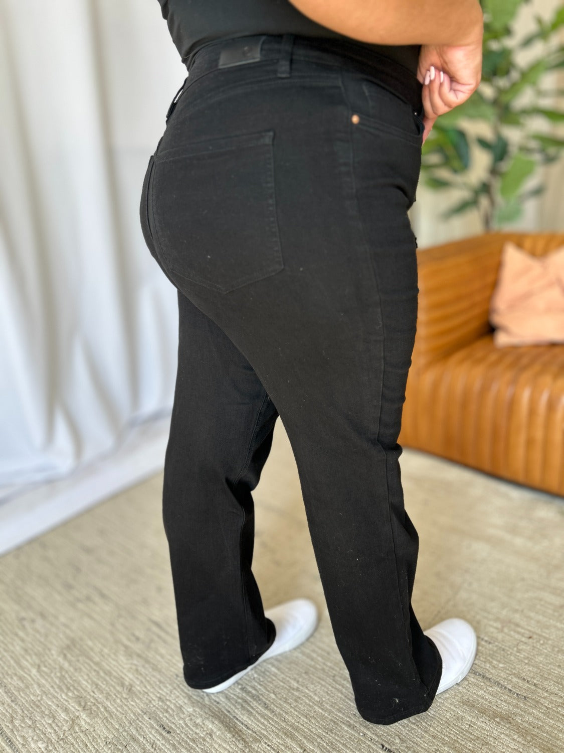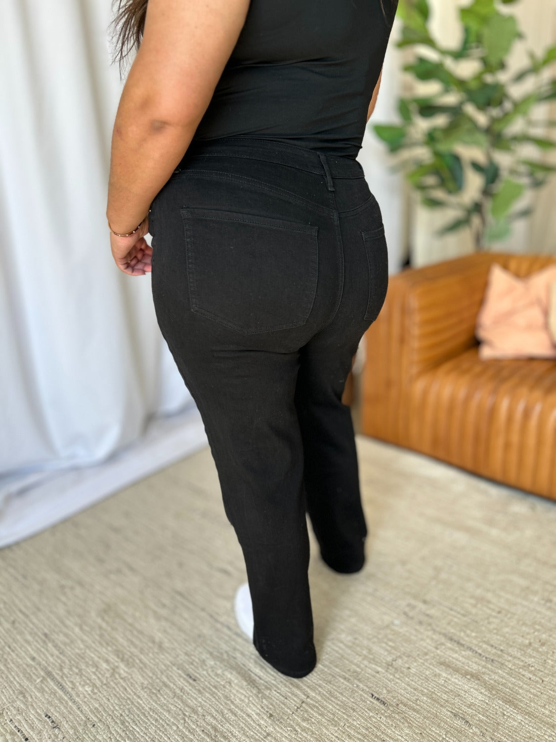 These High Rise Straight Tummy Control Jeans offer a flattering high-waist design that enhances your natural shape. The straight-leg cut provides a classic, streamlined look that suits any body type. With built-in tummy control, these jeans smooth out your midsection for a sleek silhouette. They combine timeless style with modern functionality, ideal for casual and dressier occasions. Experience comfort and confidence in every wear. Elevate your wardrobe with these versatile, chic jeans.