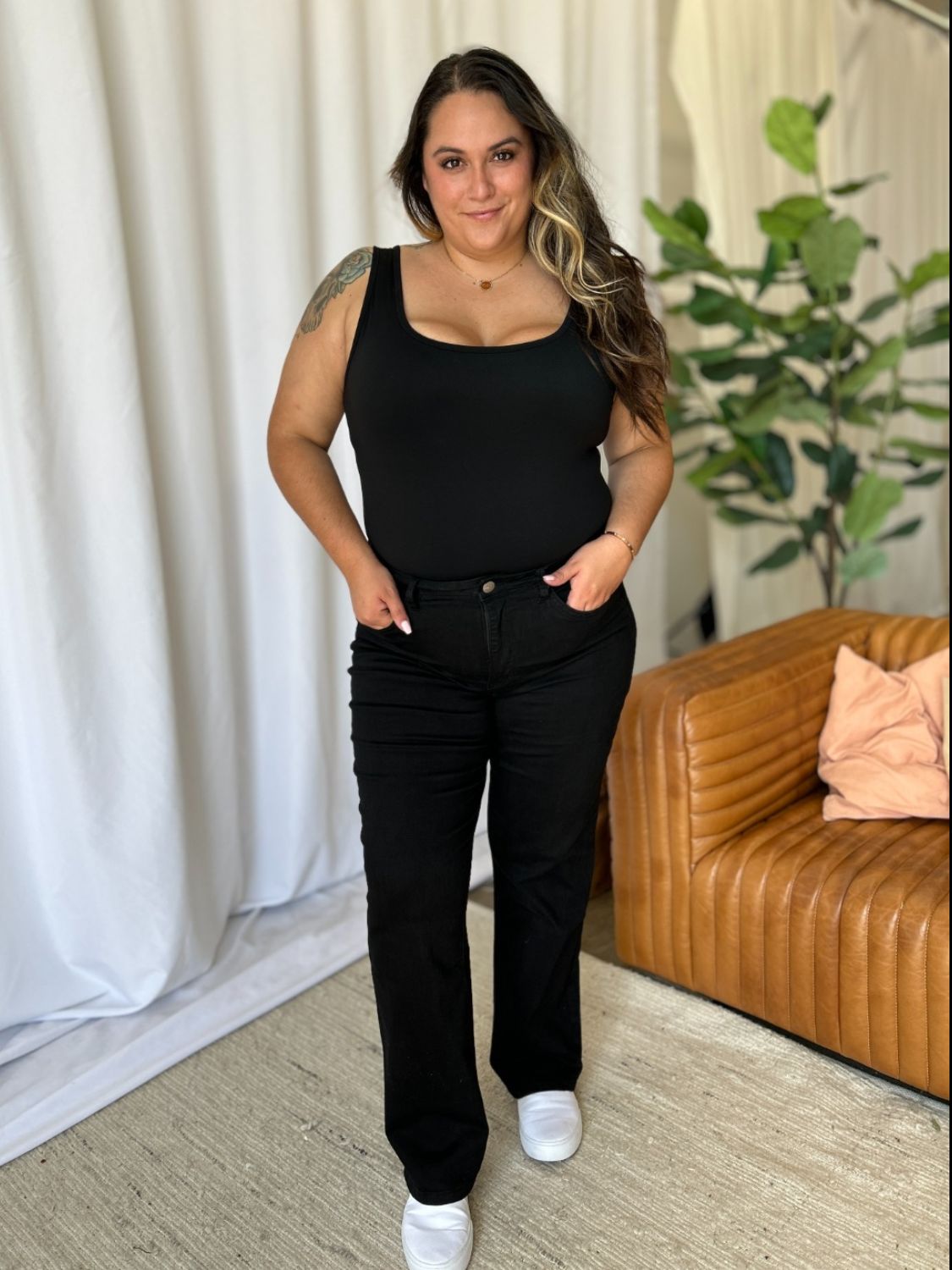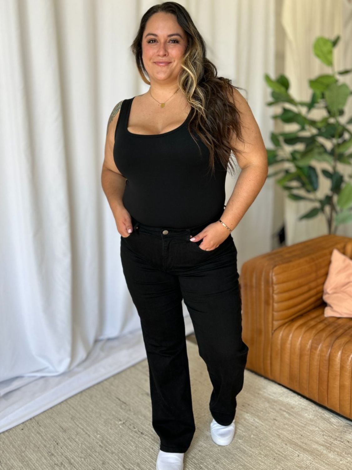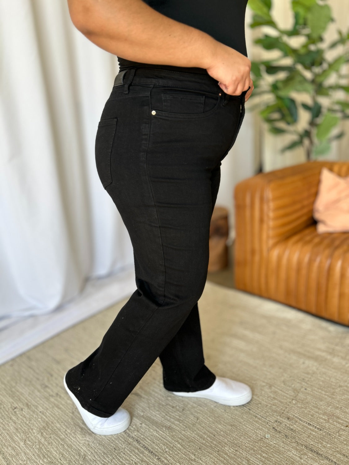 These High Rise Straight Tummy Control Jeans offer a flattering high-waist design that enhances your natural shape. The straight-leg cut provides a classic, streamlined look that suits any body type. With built-in tummy control, these jeans smooth out your midsection for a sleek silhouette. They combine timeless style with modern functionality, ideal for casual and dressier occasions. Experience comfort and confidence in every wear. Elevate your wardrobe with these versatile, chic jeans.