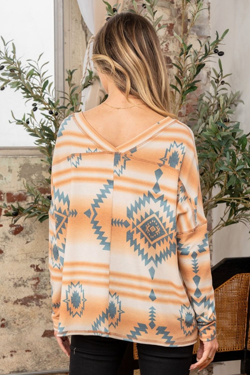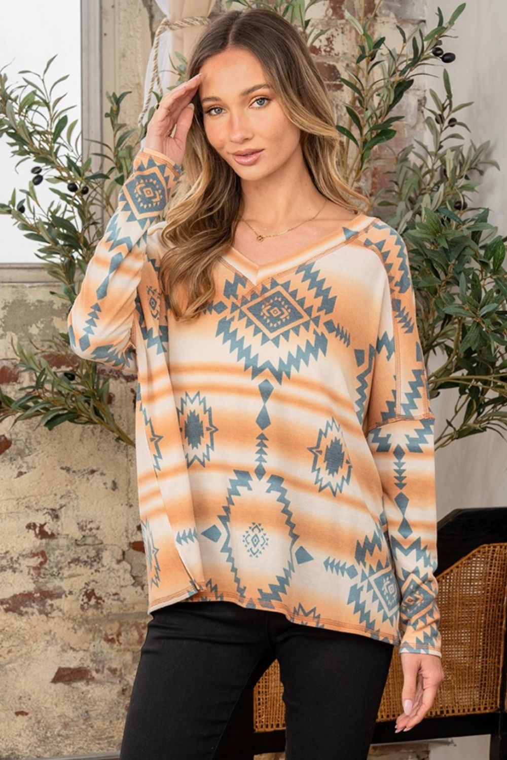 Elevate your casual wardrobe with our French Terry Multicolor Aztec Print Long Sleeve V-Neck Top. The vibrant Aztec pattern adds a touch of bold style, while the soft French terry fabric ensures all-day comfort. Perfect for any laid-back occasion, this top combines cozy warmth with eye-catching design.