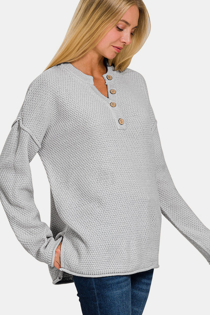 This button closure drop shoulder sweater is the perfect cozy addition to your winter wardrobe. The drop shoulder design adds a relaxed and oversized fit for ultimate comfort. The button closure detail adds a stylish touch and allows you to customize the neckline. Made with a soft and warm knit fabric, this sweater will keep you cozy on chilly days. Pair it with your favorite jeans for a casual and effortless look, or dress it up with a skirt and boots for a more polished outfit. With its trendy drop shoulder silhouette and versatile styling options, this sweater is a must-have piece for the season.