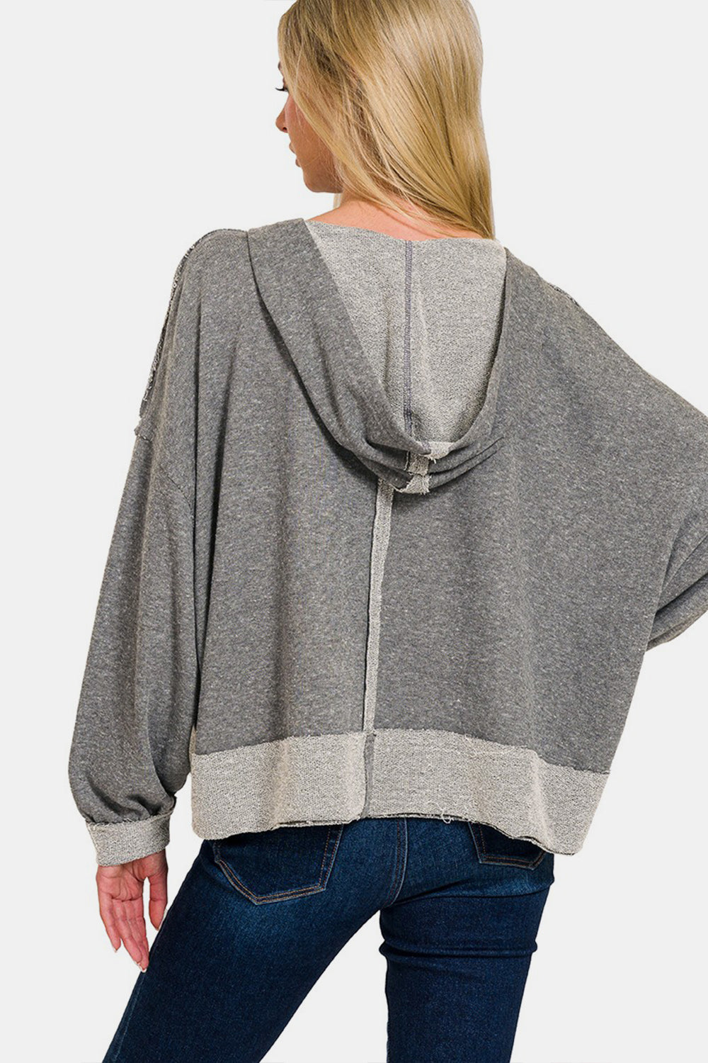 A contrast trim slit hoodie is a modern and trendy piece that features a unique design with contrasting trim details and side slits for a stylish and edgy look. The contrasting trim adds a pop of color or a bold visual element to the hoodie, creating a striking and eye-catching appearance. The side slits add a touch of interest and allow for ease of movement, making this hoodie both fashionable and functional. This versatile piece can be paired with jeans, leggings, or shorts for a casual and cool outfit. Whether you're running errands or hanging out with friends, the contrast trim slit hoodie is a must-have addition to your wardrobe for a contemporary and on-trend style.